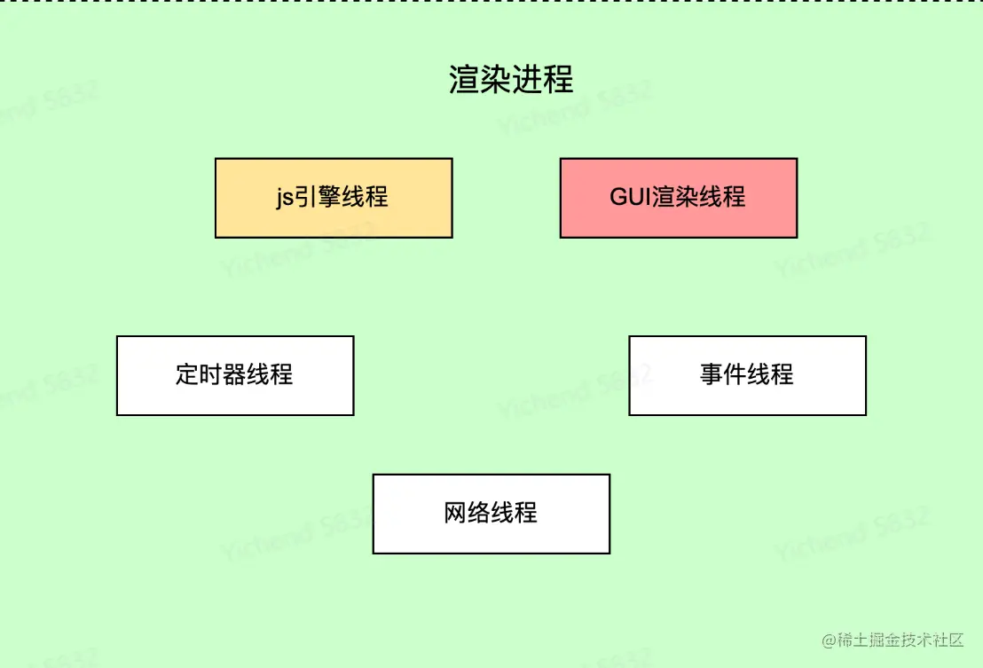 | GUI 渲染 | 负责渲染浏览器界面,解析 html、css,构建 dom 树和 render 树、布局、绘制、和 js 引擎线程互斥,GUI 更新会在 js 引擎空闲时立即执行 |