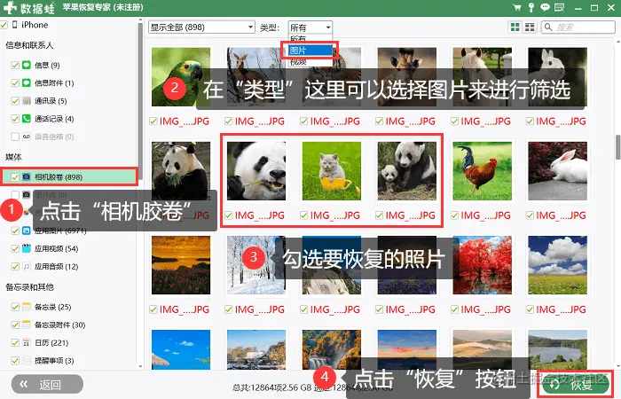 步骤2:扫描完成,在**【相机胶卷】里面找到要恢复的相片,简单预览后无误后点击【恢复】**。