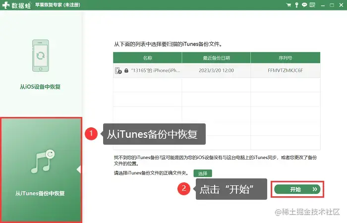 步骤1:打开下载好的软件,在扫描页面选择**【从iTunes备份中恢复】,并点击【开始】**按钮。