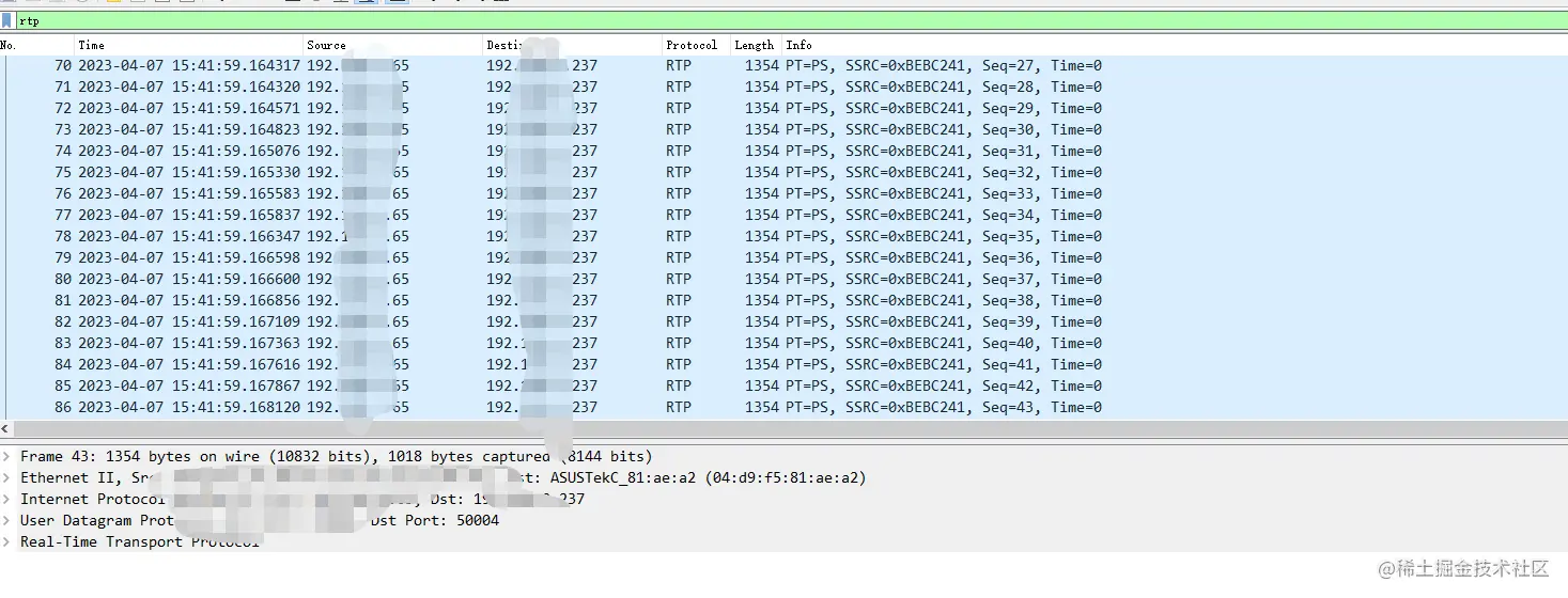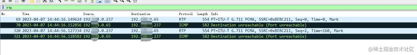 于是抓包,发现平台端虽然发送了音频流,但是设备到服务器显示端口不可达,如图:
