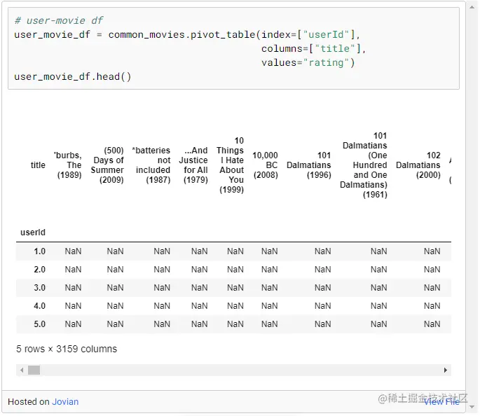 在 User-Movie 数据框中,如果用户没有对电影进行评分,则其交集处的单元格由 NaN 表示。