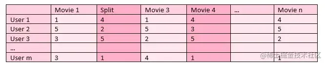 下表显示了 m 个用户对 n 部电影的评分。我们想向看过并喜欢《斯普利特》的用户推荐一部与《斯普利特》收视率相似的电影。