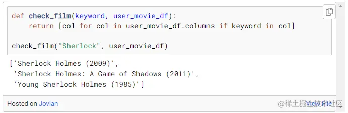 也可以手动选择和检查电影。您可以使用下面的代码片段按关键字进行搜索,以获取数据集中电影的全名。