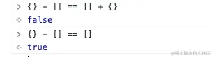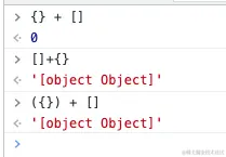 再说{} + [],在这里,{}可以大致理解为空代码block,而[]会被转为""➡️0,所以empty+0➡️0,如果避免这个情况,可以将使用()将{}包裹起来,即({}) + [],那么得到的就会等同于[] + {}。