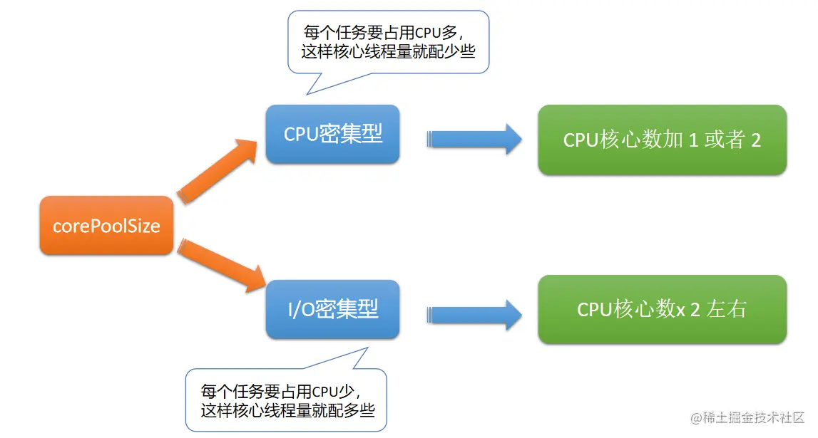- 对于 CPU 密集型任务,应该将核心线程数设置为处理器核心数加 1 或者 2;