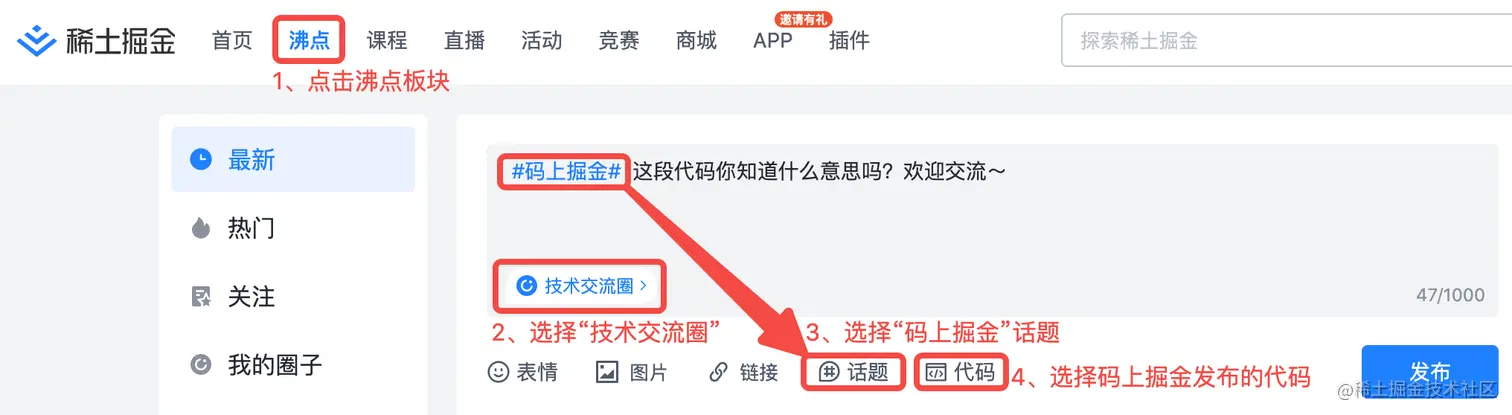 按以下指定规则发布掘金沸点(可参考下文中的发布示例截图进行操作):