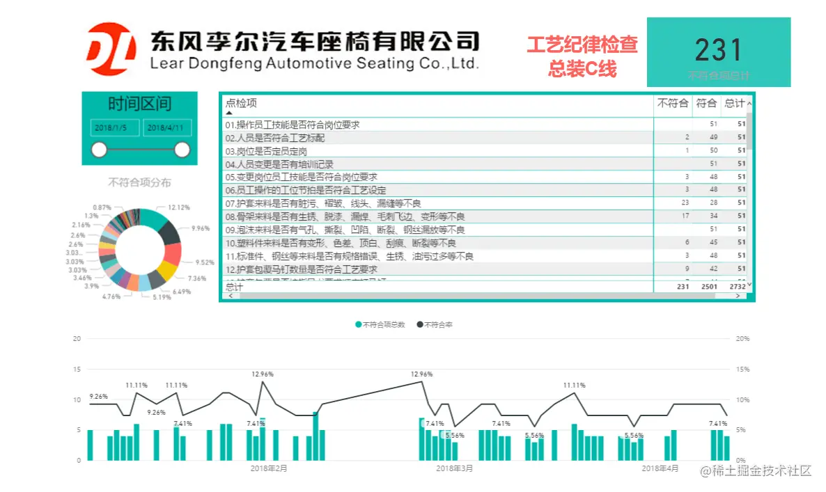 另外草料二维码为了帮助客户更精细化的管理记录数据,已经与微软Power Bi成为了合作伙伴,柳州东风李尔便是通过草料二维码搭建了Power Bi可视化数据模型,针对工艺纪律检查的点检项进行数据可视化输出分析结果。