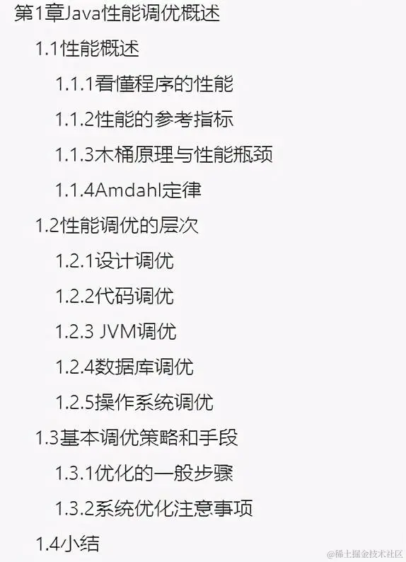 总之,一旦遇到“性能优化”问题,很少人能够由点及面逆向分析,最终找到瓶颈点和优化方法,而性能优化是软件工程的深水区,也是衡量一个程序员能力高低的标准。 俗话说:“授人以鱼不如授人以渔”。在这分享这份性能调优实战手册及配套视频给有需要的小伙伴,希望对大家的学习进阶会有较大的帮助!由于篇幅原因,本文只展示了目录和内容截图,有需要学习性能调优的小伙伴获取资料方式在文章末尾哟