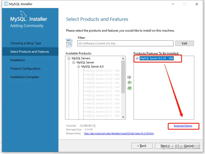 点选右侧你要安装的MySQL,在下方显示Advance options(高级选项),点击高级选项指定安装位置。
