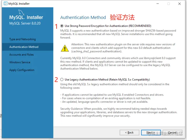 1处说的是使用强密码加密进行身份验证(推荐的),采用caching_sha2_password验证,但是这个不兼容MySQL5的密码验证方式。
