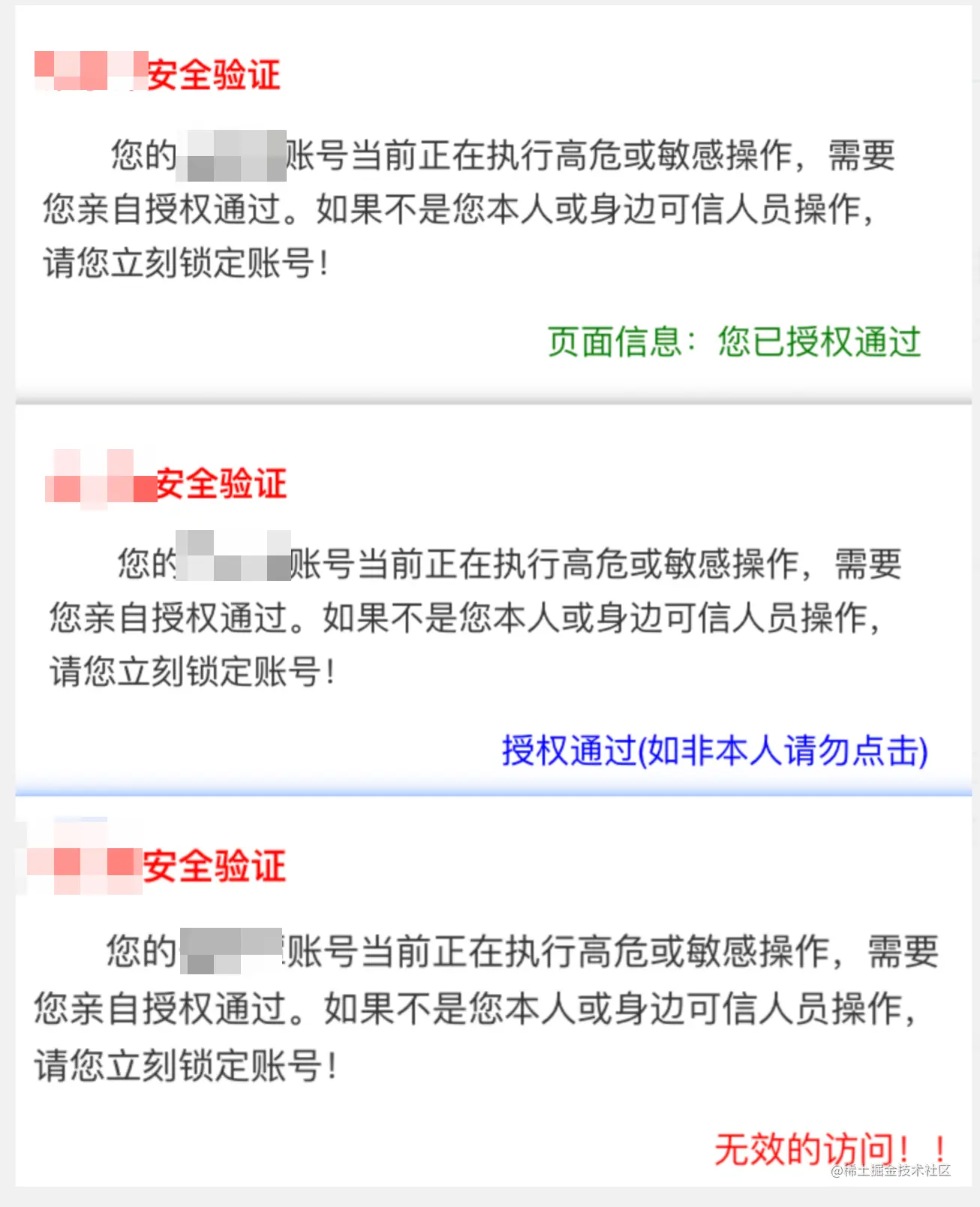 第二行文本(文本样式:缩进):您的XXX账号当前正在执行高危或敏感操作,需要您亲自授权通过!,