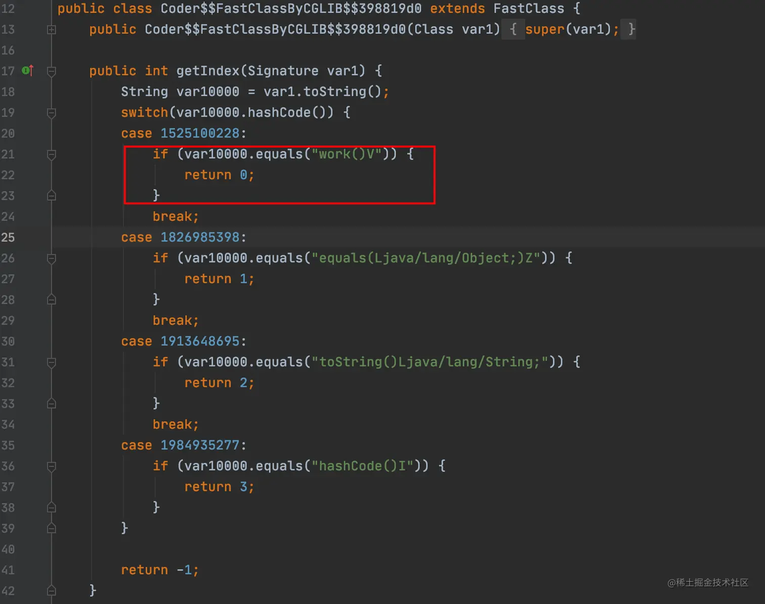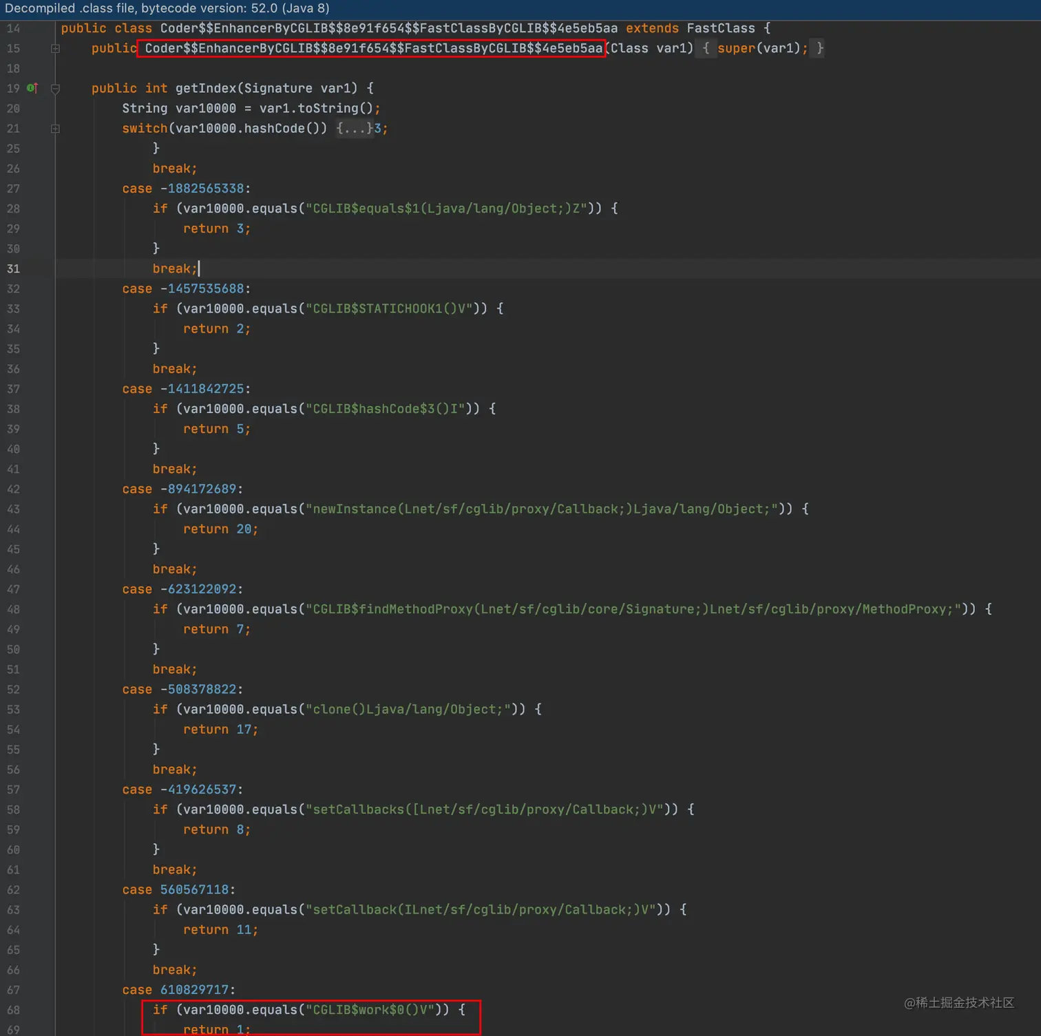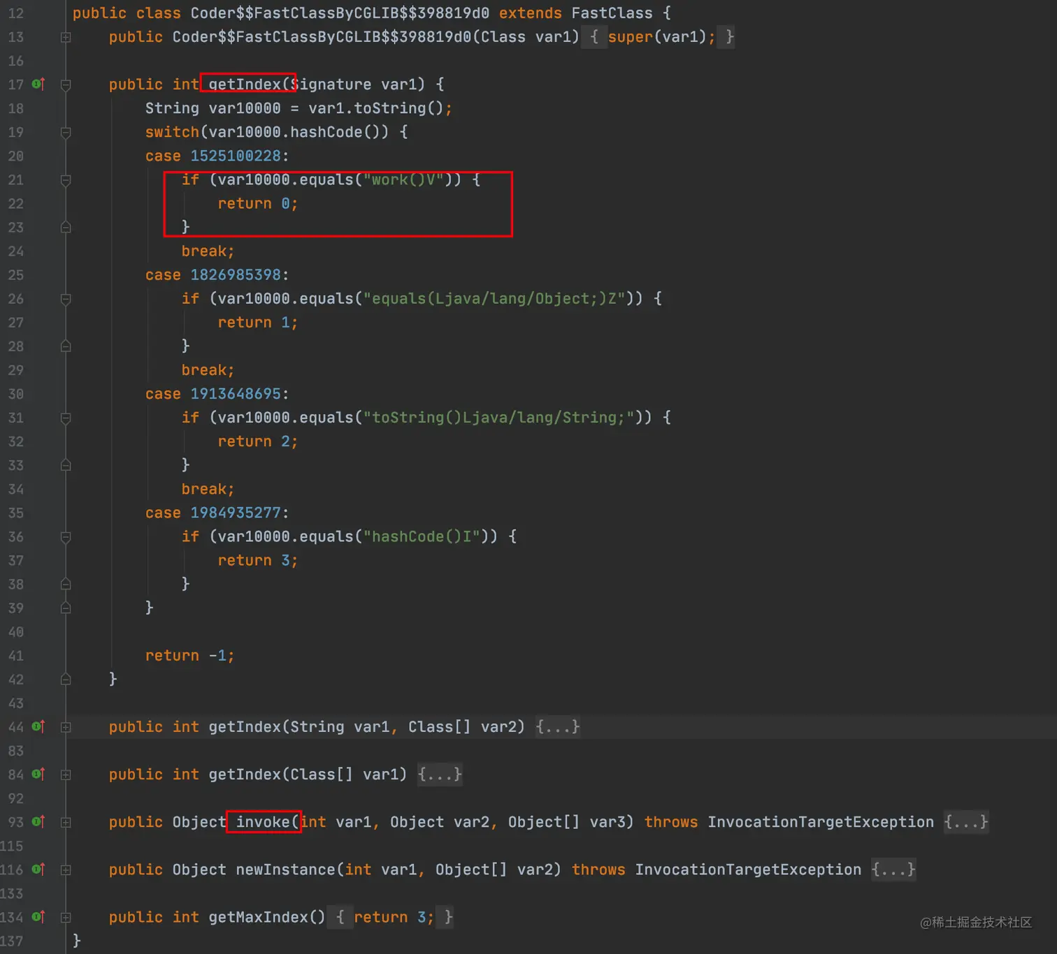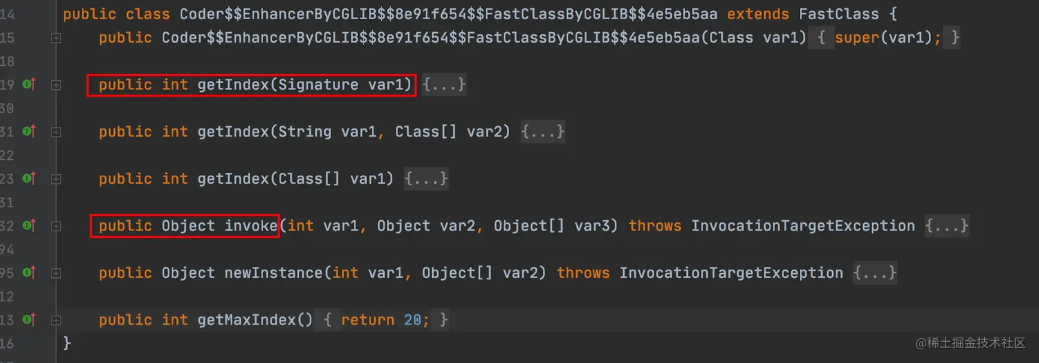 最后看下Coder$$FastClassByCGLIB$$398819d0,这个类是被代理类Coder的索引类,重点也是关注下里面的