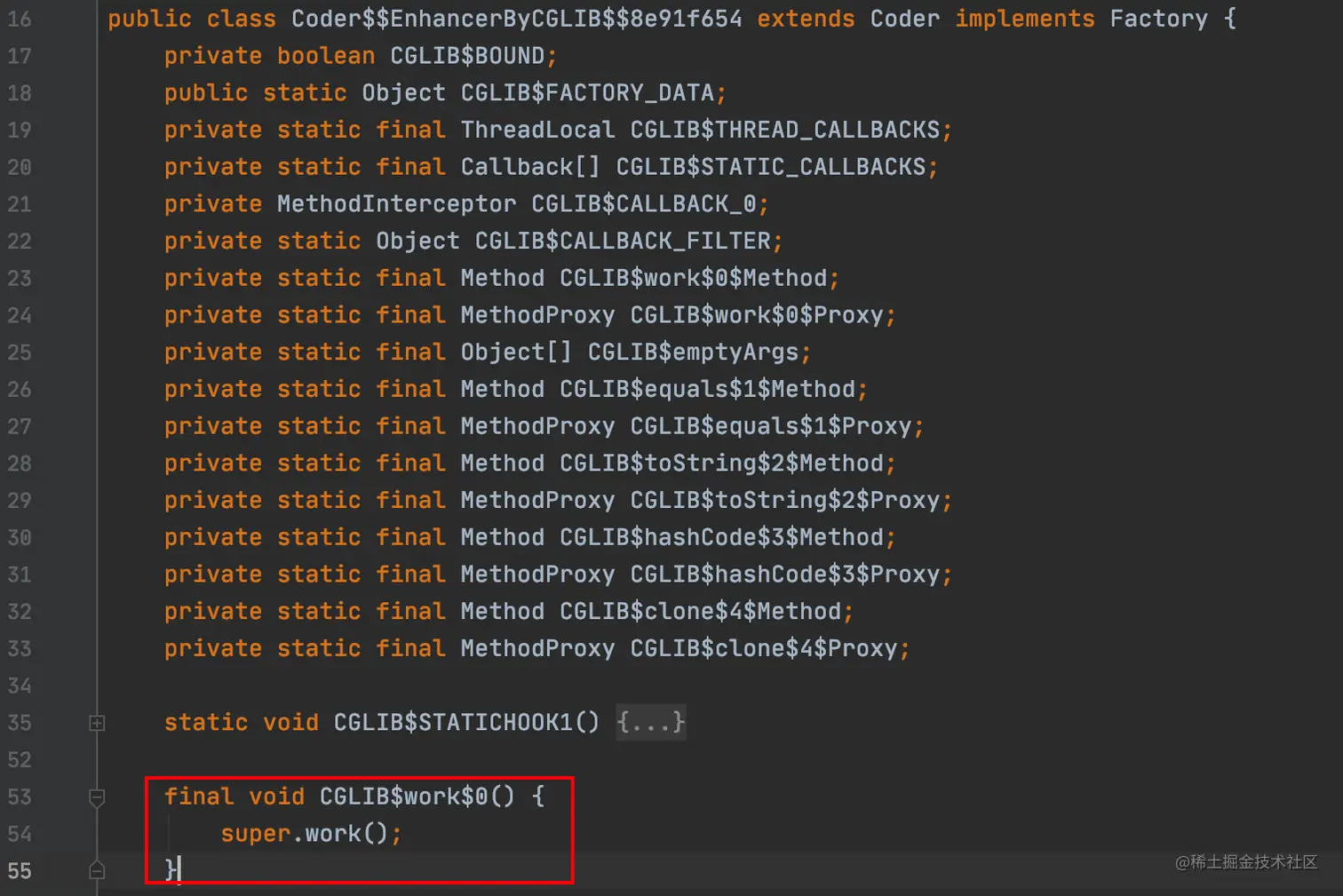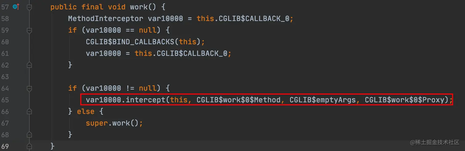 coder.work();首先调用的是Coder$$EnhancerByCGLIB$$8e91f654的work()方法:
