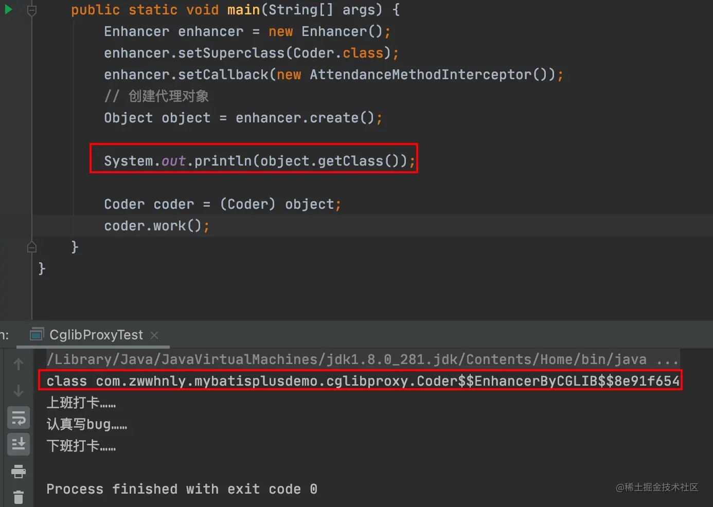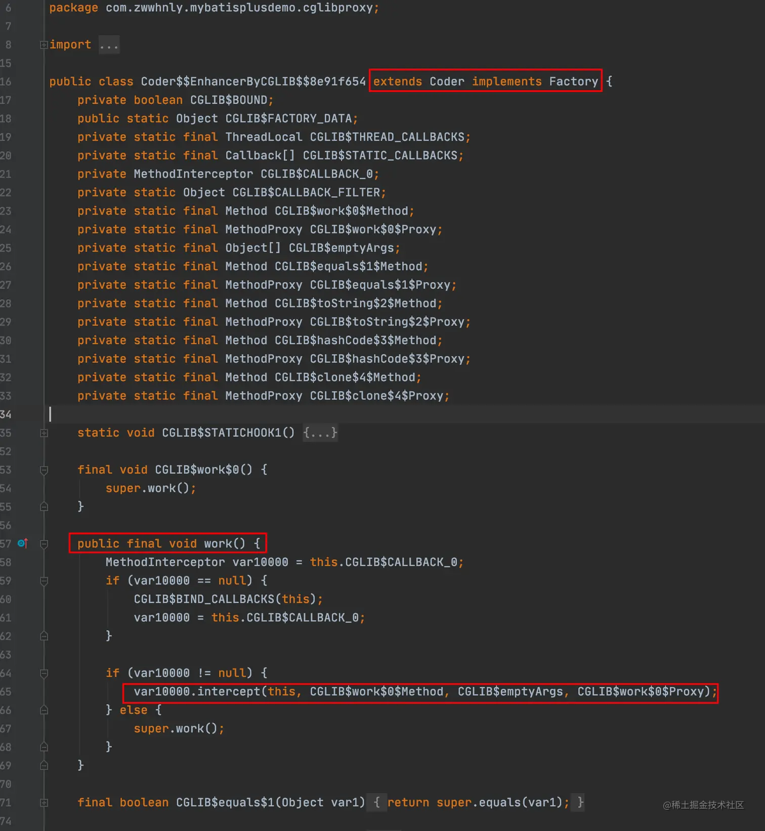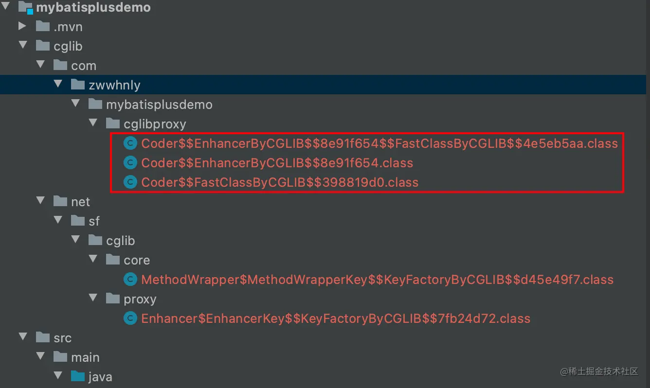 图中的com.zwwhnly.mybatisplusdemo.cglibproxy.Coder$$EnhancerByCGLIB$$8e91f654就是CGLIB生成的代理类的名称。