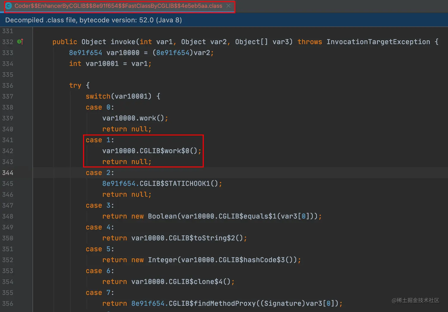 代理类Coder$$EnhancerByCGLIB$$8e91f654的CGLIB$work$0()方法: