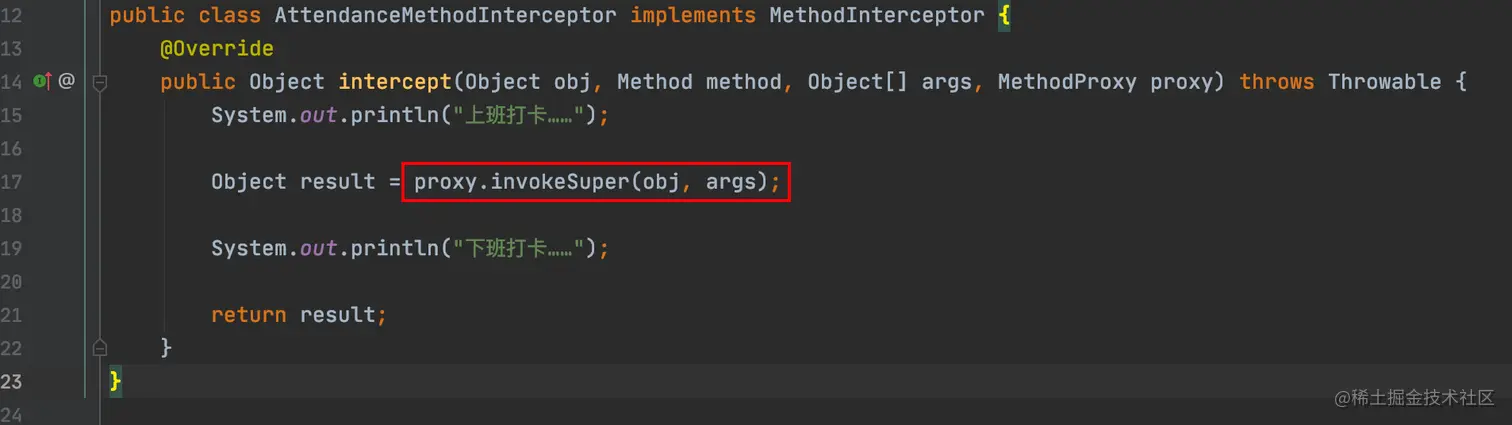 这里的var10000是自定义的方法拦截器AttendanceMethodInterceptor,所以执行的是红色截图里的intercept()方法,也就是: