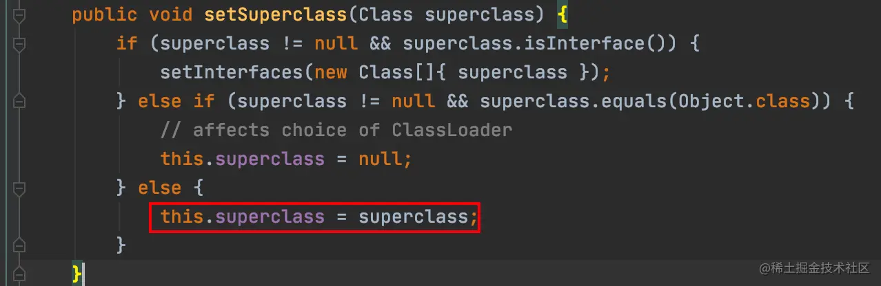 看下上面的测试类代码,首先是创建了一个net.sf.cglib.proxy.Enhancer对象,然后调用了setSuperclass()方法