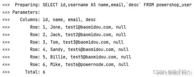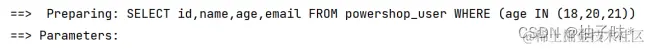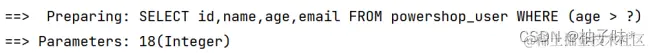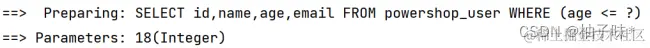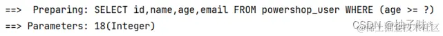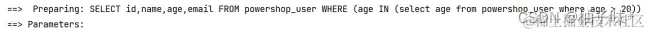 | @Test void inSql2(){ ** //1. **创建 QueryWrapper 对象 ****LambdaQueryWrapper lambdaQueryWrapper = new LambdaQueryWrapper<>(); ** //2. **设置条件,指定字段名称和值 ****lambdaQueryWrapper.inSql(User::getAge,"select age from powershop_user where age > 20"); ** //3. **使用条件完成查询 ****List users = userMapper.selectList(lambdaQueryWrapper); System.out.println(users); } |