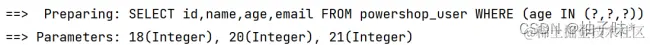 | @Test void in(){ ** //1. **创建 QueryWrapper 对象 ****LambdaQueryWrapper lambdaQueryWrapper = new LambdaQueryWrapper<>(); ** //2. **设置条件,指定字段名称和值 ****ArrayList arrayList = new ArrayList<>(); Collections.addAll(arrayList,18,20,21); lambdaQueryWrapper.in(User::getAge,arrayList); ** //3. **使用条件完成查询 ****List users = userMapper.selectList(lambdaQueryWrapper); System.out.println(users); } |