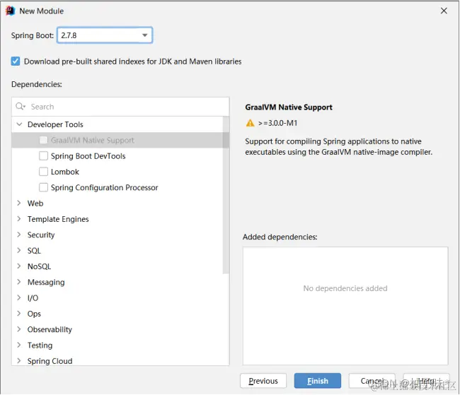 这里我们选择springboot2.7.8的版本,并不勾选依赖,随后通过pom.xml手动添加