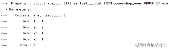 | @Test void groupBy(){ ** //1. **创建 QueryWrapper 对象 ****QueryWrapper queryWrapper = new QueryWrapper<>(); ** //2. **设置条件,指定字段名称和值 ***queryWrapper.groupBy("age"); queryWrapper.select("age,count() as field_count"); ** //3. **使用条件完成查询 ****List<Map<String, Object>> maps = userMapper.selectMaps(queryWrapper); System.out.println(maps); } |