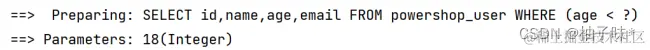 | @Test void lt(){ ** //1. **创建 QueryWrapper 对象 ****LambdaQueryWrapper lambdaQueryWrapper = new LambdaQueryWrapper<>(); ** //2. **设置条件,指定 字 段名称和值 ****Integer age = 18; lambdaQueryWrapper.lt(User::getAge,age); ** //3. **使用条件完成查询 ****List users = userMapper.selectList(lambdaQueryWrapper); System.out.println(users); } |