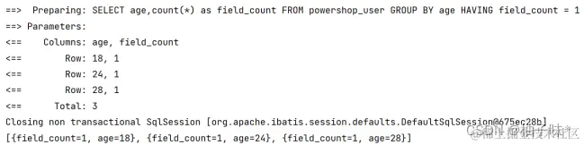 | @Test void having(){ QueryWrapper queryWrapper = new QueryWrapper<>(); ** // **分组字段 ****queryWrapper.groupBy("age"); ** // **查询字段 ***queryWrapper.select("age,count() as field_count"); ** // **聚合条件筛选 ****queryWrapper.having("field_count = 1"); List<Map<String, Object>> maps = userMapper.selectMaps(queryWrapper); System.out.println(maps); } |