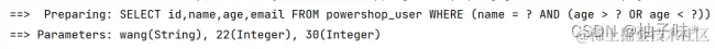 | @Test void and2(){ ** //1. **创建 QueryWrapper 对象 ****LambdaQueryWrapper lambdaQueryWrapper = new LambdaQueryWrapper<>(); ** //2. **构建条件查询语句 ****lambdaQueryWrapper.eq(User::getName,"wang").and(i -> i.gt(User::getAge,26).or().lt(User::getAge,22)); ** //3. **完成查询 ****List users = userMapper.selectList(lambdaQueryWrapper); System.out.println(users); } |