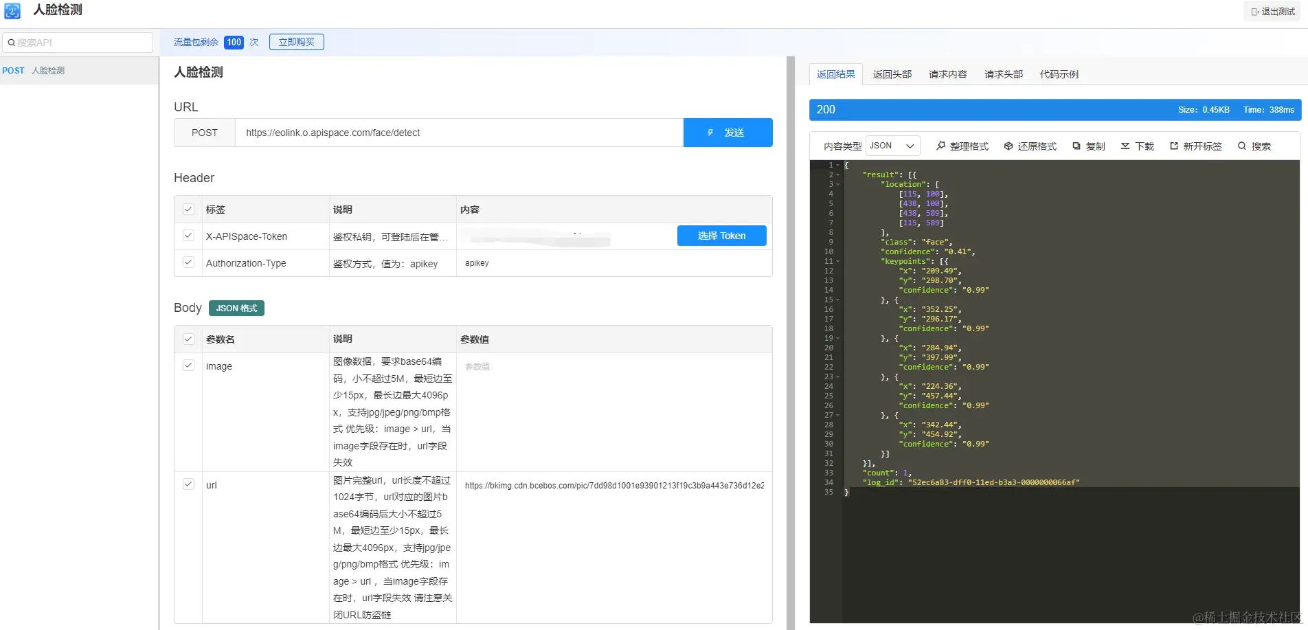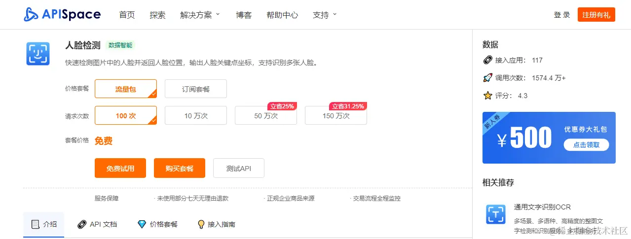 注册登录 APISpace 之后,在 人脸检测 API 详情页 可以看到【免费试用】的按钮,点击即可获得相应的免费次数。