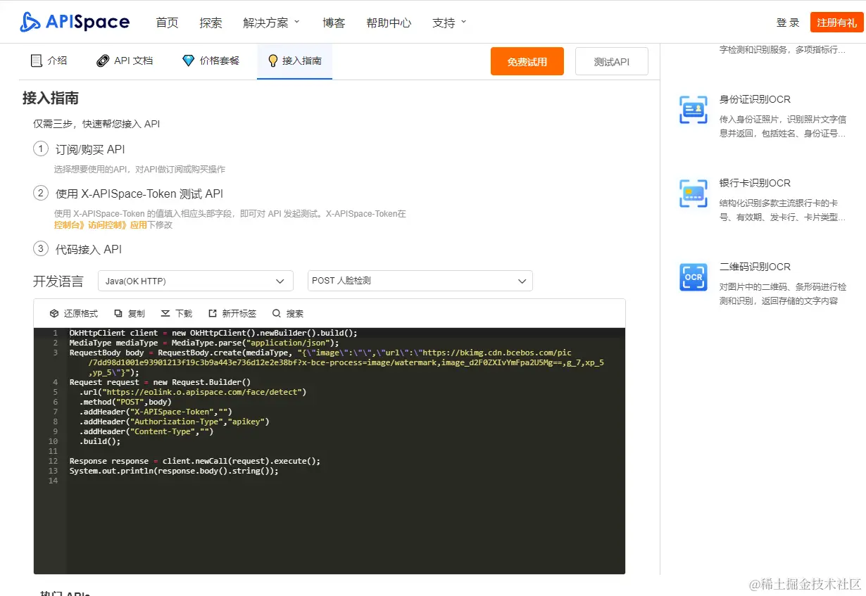 在APISpace 网站上,我们可以在 人脸检测 详情页上,获取它的示例代码。