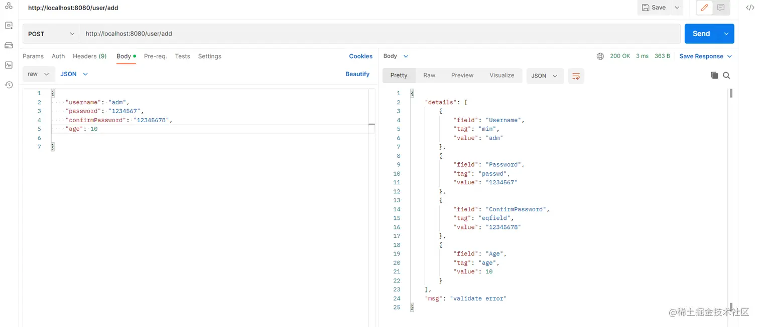 示例中,我们以简单的密码和年龄校验为例,实现了简单业务,下面看看相关测试。