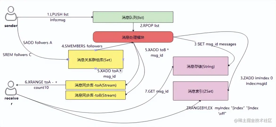 - 将消息ID推入Stream类型的消息同步库,每个Stream对象对应一个接收者,接收者可以通过XRANG命令获取一个范围内的未读信息ID;
