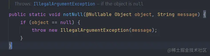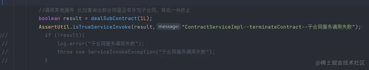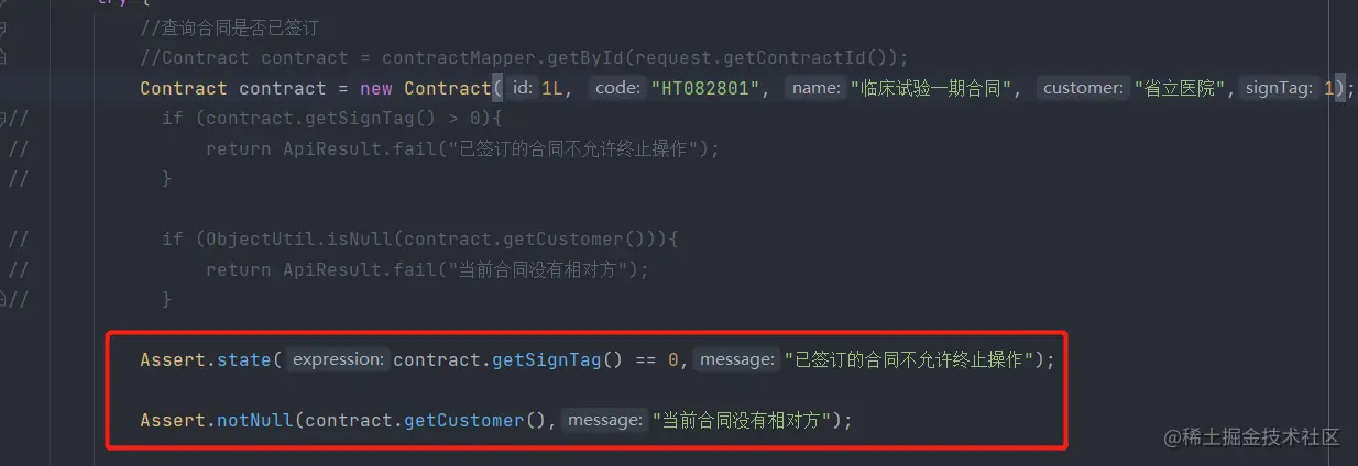 像上图中一个代码块中会有很多的校验,而实际项目中非空或者一些业务判断都是很频繁的。我们来改造一下上图中的代码,使用断言后两行代码就解决了