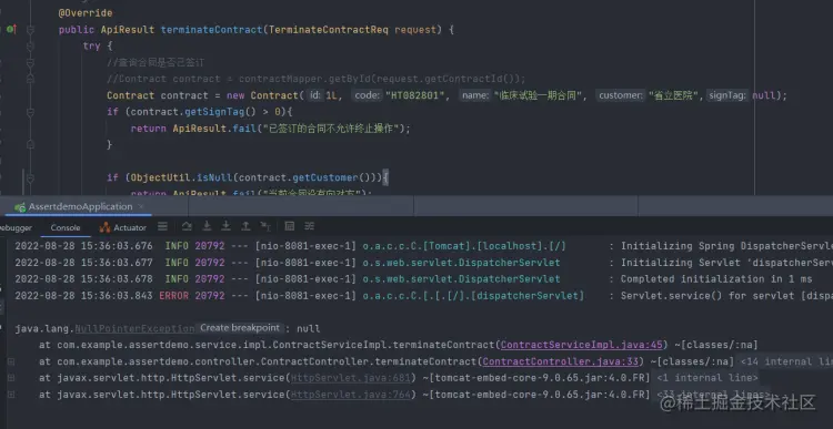 通过以上描述我们也可以看出,项目中除了空指针这种异常,还有断言抛出的异常,还有自定义异常,对各种各样的异常统一处理,使得返回更加友好的信息。