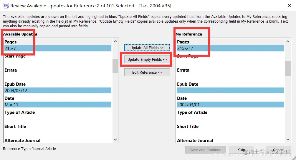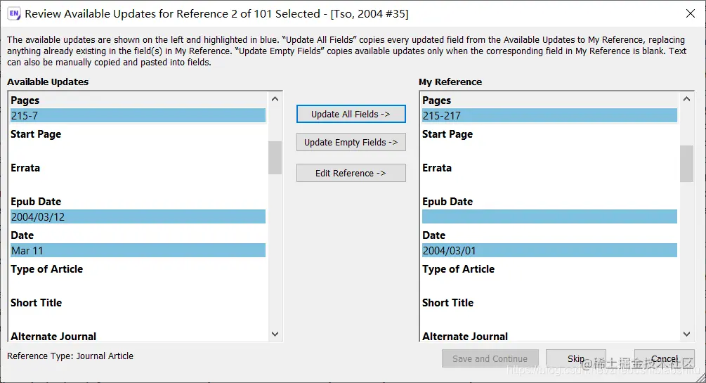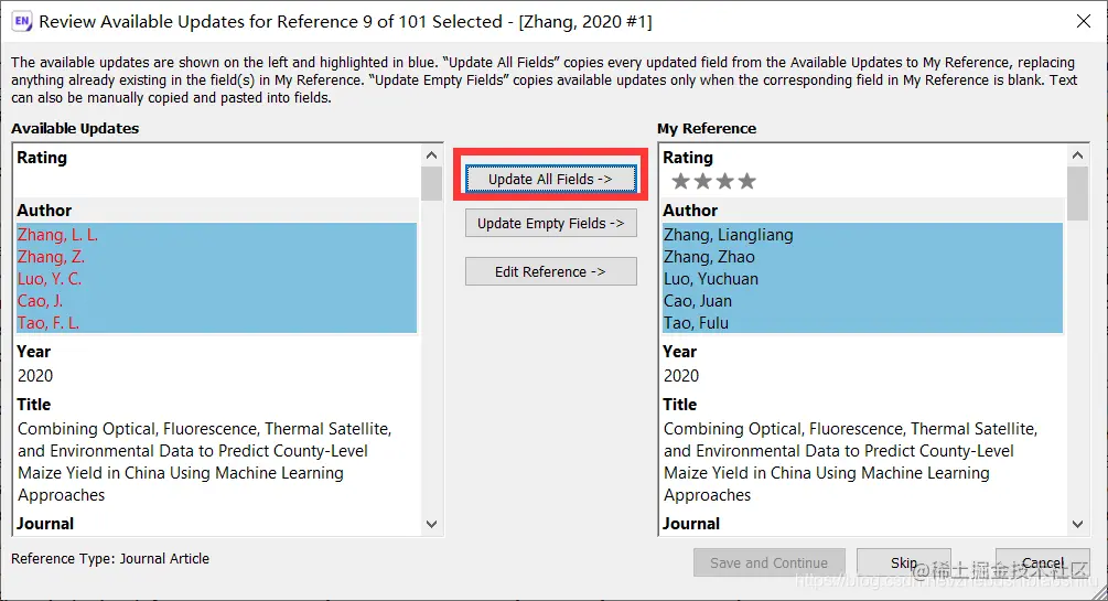 其中,如果某一个参考文献条目搜索到了更新,会弹出如下所示的提示框。其中显示了哪些字段可以更新——左侧为搜索到的更新情况,右侧为原本我们EndNote中的情况。
