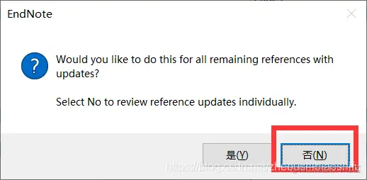 要注意,如果选择了“Updata All Fields”或“Updata Empty Fields”,就会弹出一个是否默认对今后全部的参考文献条目执行同样的操作。在这里我选择“否”(因为上面选择了“Updata Empty Fields”,而之后如果有的参考文献可以更新姓名拼音,我们是需要选择“Updata All Fields”的,所以这里不要默认)。