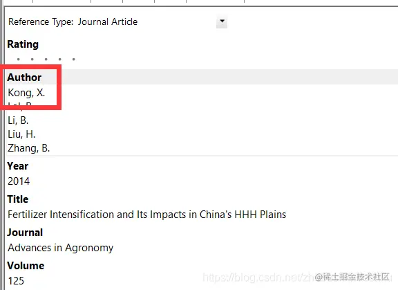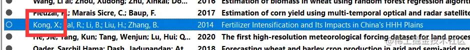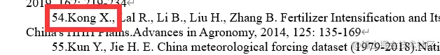 可知其第一作者的姓为Kong,名为Xiangbin,很显然,该作者除了姓之外的名共有两个字。假如,我们现在希望出现在参考文献中的这篇文章作者缩写为Kong XB或Kong X. B.或Kong X B,总之就是希望名的第二个字——bin的首写字母B也显示在参考文献中;而有时会出现这样的情况:在EndNote中,我们引入的参考文献本身就不含该作者名的第二个字的拼音bin或首写字母B: