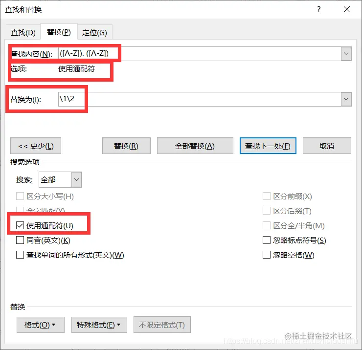 解释一下上述替换的设置:其中,查找内容中的([A-Z]). ([A-Z])表示寻找在两个大写字母中间的. (也就是点和空格),然后替换为中的\1\2表示只保留查找内容中的括号内的内容(替换为中\1表示前面第一个括号中内容,\2表示第二个括号中内容)。