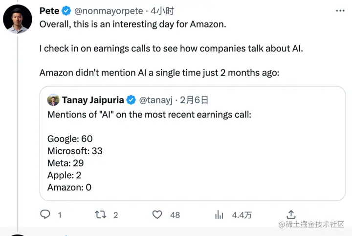 虽然 AWS 一直在为 Hugging Face、Stability AI 等大模型明星公司提供机器学习算力,不过亚马逊很少透露合作的细节。有网友曾统计,在过去一段时间的财报财报会议上,亚马逊提到 AI 的次数几乎为零。