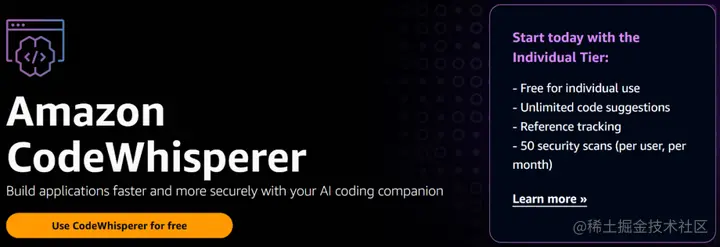 现在,亚马逊宣布 CodeWhisperer 正式可用,免费向所有个人用户开放,不设任何资质或使用时长的限制。另外还提供引用跟踪和每个月 50 次的安全扫描服务。用户只需邮箱注册,无需亚马逊云服务账号。企业客户可以选择包含更多高级管理功能的专业版。