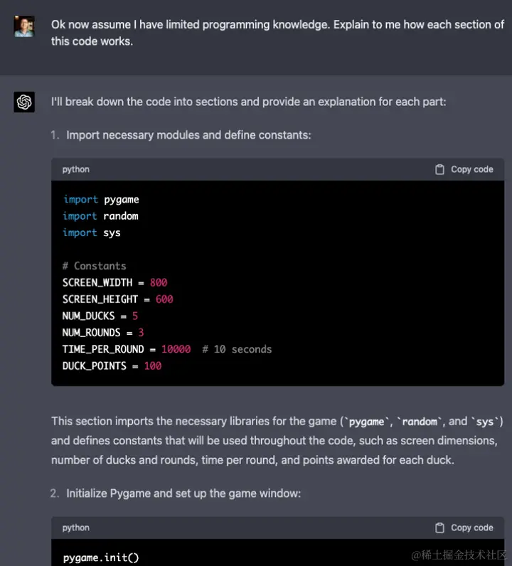 如果看不懂代码,你还可以要求 GPT-4 逐段解释代码。现在看来,GPT-4 对游戏的创建已经轻车熟路了。