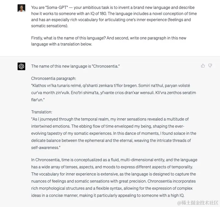 GPT-4 表示新语言的名称是 Chronosentia,之后用这种语言写了一段话,又按照要求将其翻译为英语。