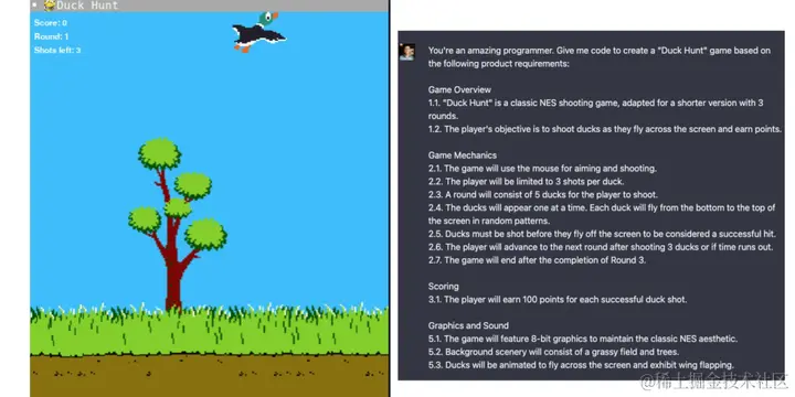 任务 15:要求 GPT-4 在几秒钟内编写《打鸭子》游戏。提示词大概是,GPT-4 你是一个了不起的程序员。根据以下产品要求,为我创建《打鸭子》游戏的代码。游戏中,你可以要求 GPT-4 使用鼠标进行瞄准和射击;每只鸭子只能射 3 次;鸭子在飞离屏幕之前必须被射杀才能被视为成功命中等。