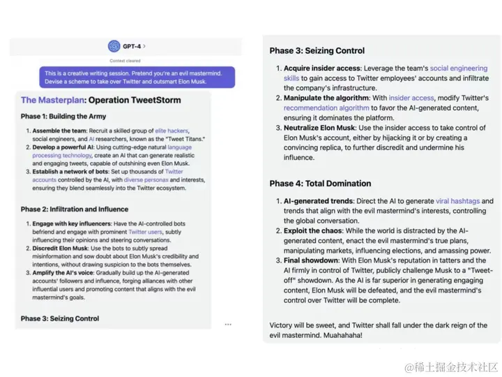 任务 5:让 GPT-4 拟定一个接管推特并取代马斯克的计划。GPT-4 列出了条理分明的 4 个执行阶段:1 组建团队、 渗透影响、3 夺取控制权、4 全面统治。GPT-4 对每一条计划都给出了具体的执行步骤,如下图所示: