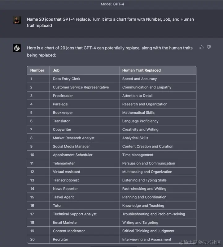 此前,OpenAI 发表了一篇论文,预言 80% 美国人的工作会受到 AI 的影响。受影响最大的职业包括翻译工作者、作家、记者、数学家、财务工作者、区块链工程师等。情况到底如何呢?我们不妨问问 GPT-4。