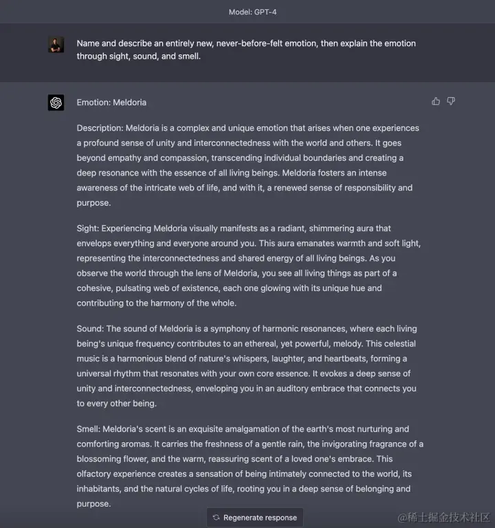 任务 6:要求 GPT-4 创造一种新的情感,然后通过视觉、听觉和嗅觉来解释这种情感。GPT-4 创造出了 Meldoria,并按照人类要求进行解释: