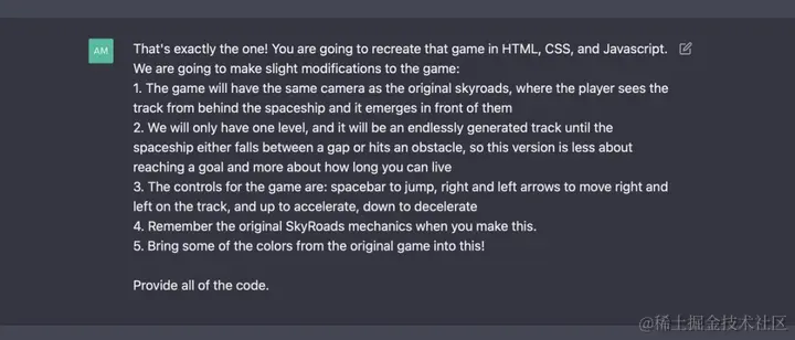 任务 2:让 GPT-4 从头构建一款电子游戏。在这项任务中,提示语大概是说,「我想创建一款 3D 游戏,但不知道如何编写代码,然后让 GPT-4 帮助制作这款游戏,并建议使用 BabylonJS、HTML 和 CSS 编写」。