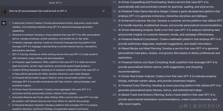 任务 8:基于 GPT-4 创造 20 种新业务,并说明这些工作可以做哪些事。GPT-4 给出的答案如下所示:例如基于 GPT-4 构建个人 Al 助理,其可以提供个性化建议、管理日程安排、回答问题和处理日常任务;又比如基于 GPT-4 开发辅导类产品,帮助学生完成家庭作业、论文写作、考试准备、在线辅导等。
