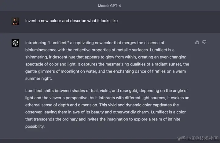 任务 16:要求 GPT-4 发明一种新的颜色,并描述它的样子。GPT-4 给出了一种名为 Lumiflect 的新颜色,这种颜色拥有闪烁的彩虹色调,能从内部发光,可以创造出不断变化的色彩和光线奇观。它捕捉了璀璨的日落、水面上柔和的月光以及温暖夏夜萤火虫迷人般的舞蹈。Lumiflect 在蓝绿色、紫色和玫瑰金之间切换,具体取决于光线角度和观看者的视角……