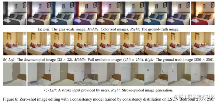 图 6a 展示了 Consistency Model 可以在测试时对灰度卧室图像进行着色,即使它从未接受过着色任务的训练,可以看出,Consistency Model 的着色效果非常自然,很逼真;图 6b 展示了 Consistency Model 可以从低分辨率输入生成高分辨率图像,Consistency Model 将 32x32 分辨率图像转成 256x256 高分辨率图像,和真值图像(最右边)看起来没什么区别。图 6c 证明了 Consistency Model 可以根据人类要求生成图像(生成了有床和柜子的卧室)。